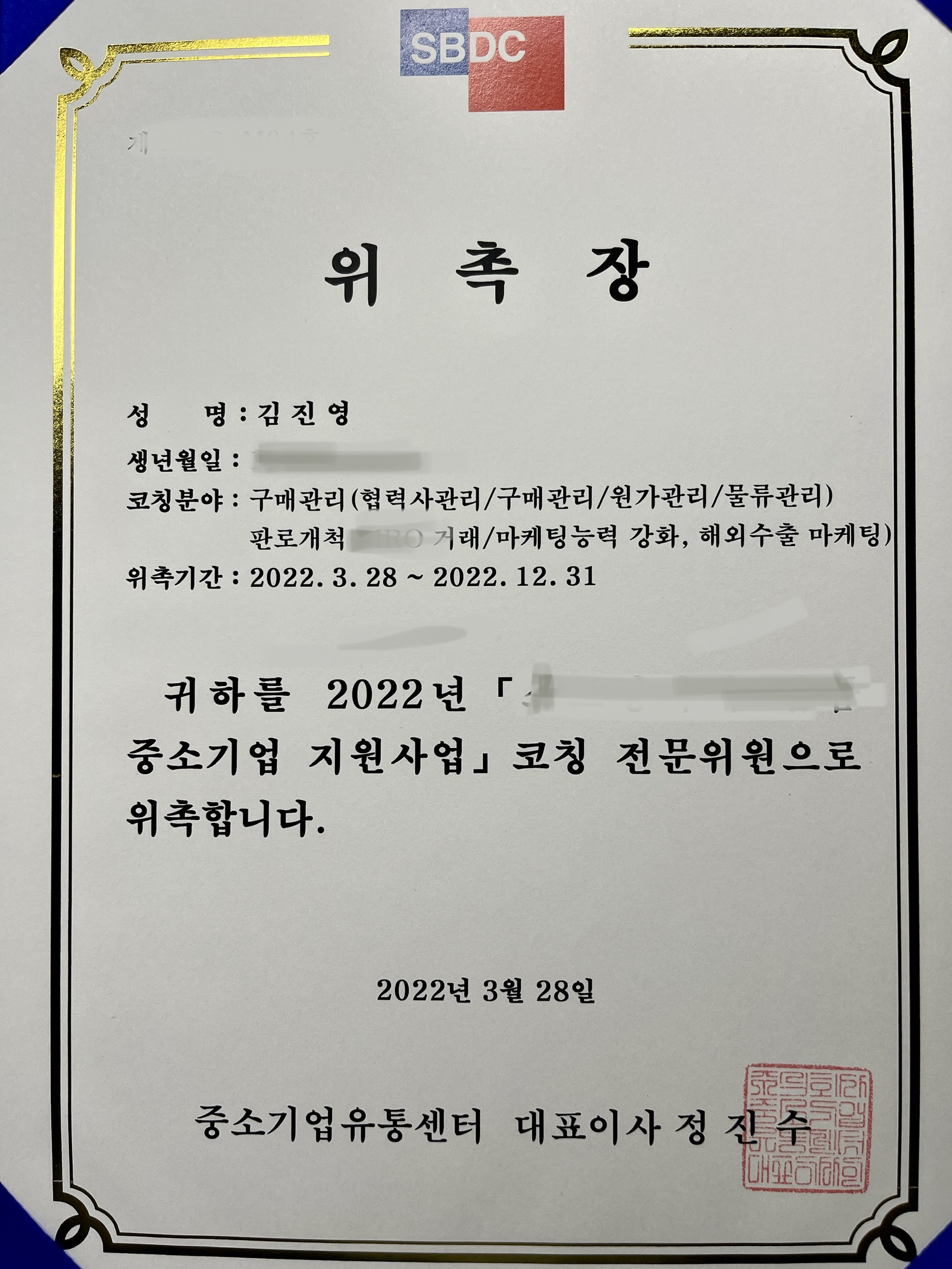 중소기업유통센터 중소기업 지원사업의 현장코칭 전문위원으로 재차 위촉됐습니다. 2016년부터 6년 째입니다. 분야는 구매관리, 판로개척, 공공입찰 입니다.