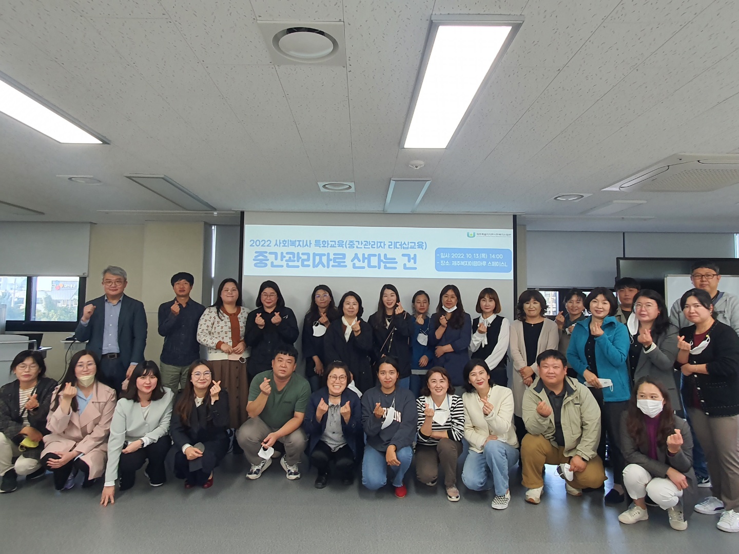 제주도에만 350여 개의 사회복지 시설단체가 있다고 합니다. 여기엔 다양한 중간관리자 분들이 계시고요. 요즘 직원들과의 소통, 과도한 업무량 등으로 많은 어려움을 겪고 계신다고 해요. 지인 중 사회복지 관련한 일을 하는 사람도 있고, 작년에는 대전에 계시는 사회복지사 팀장님을 코칭해드렸던 경험이 있어 더 정성을 드려 강의했습니다.