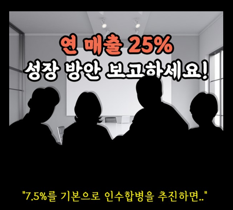 “보시는 바와 같이 우리 사업의 경우 인수할 만한 큰 기업이 시장에 거의 없다시피 합니다. 따라서 현실성 측면에서 A사, B사 등이 고려 대상이며, 이를 실현한다면 대략 20%까지는 성장할 수 있을 것으로 예상됩니다.”